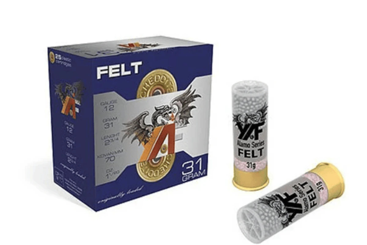 YAF 12 CAL 31 GR FELT წარმოადგენს 12 კალიბრის ხარისხიან სანადირო ვაზნას, რომელიც აღჭურვილია 31 გრამიანი ტყვიის დატვირთვით და ქეჩის საცობით (Felt wad). Felt ტიპის საცობი უზრუნველყოფს რბილ, სტაბილურ გასროლას და უკეთეს განაწილებას ახლო და საშუალო დისტანციებზე.